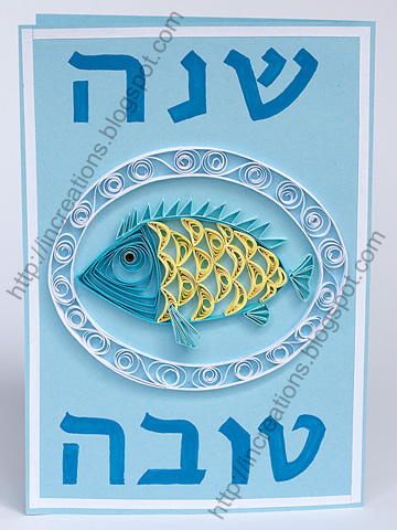 Greeting cards with paper quilling for the Jewish New Year — the third and the last part. Previous parts: Rosh Hashanah cards with quilled pomegranates and greeting cards with quilled apples. Honey and apples to make the new year sweet, pomegranates and fish have several meanings in Judaism. I'm not going to tell you about symbolic foods, I just want to with you "Shana Tova Umetukah" — a good and sweet year!