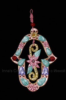 Here's a new addition to my pearl clay Hamsas that I like very much (the Hamsa with a butterfly and Hamsa with a flower). This Hamsa is decorated with beads, flowers, leaves and ladybugs, too, although the design is little different. The hanger is made of macramé. It's quite easy to make a Hamsa like this, I've already written a short tutorial.